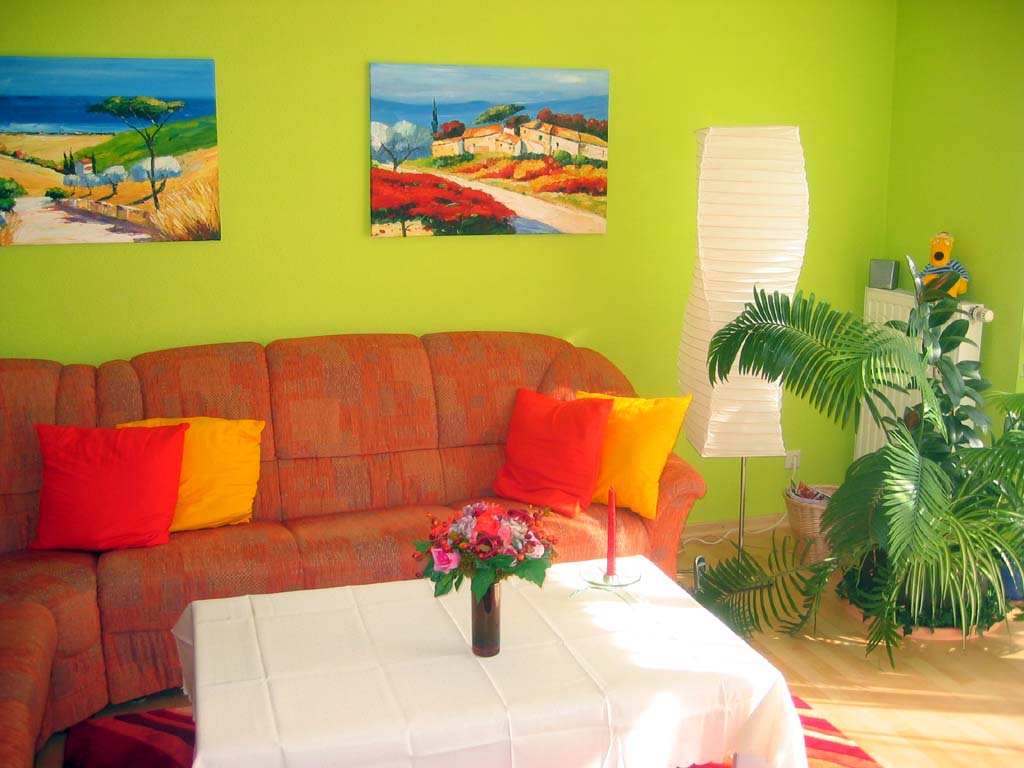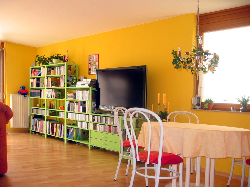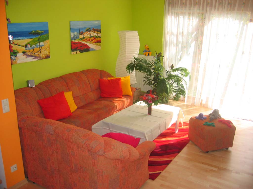 Nachdem wir nun 10 Jahre in Weiß, Blau und Grau gelebt haben, wollten wir wärmere Farben für unser Wohnzimmer haben. Den blaugrauen Teppich haben wir gegen ein helles Ahorn Parkett ausgetauscht und die weißen Wände sind nun gelb, orange und grün. Da die Sitzecke orange ist, haben wir die Wände in diesem Bereich grün angestrichen. Das gibt einen schönen Kontrast, passt aber trotzdem gut zusammen. |