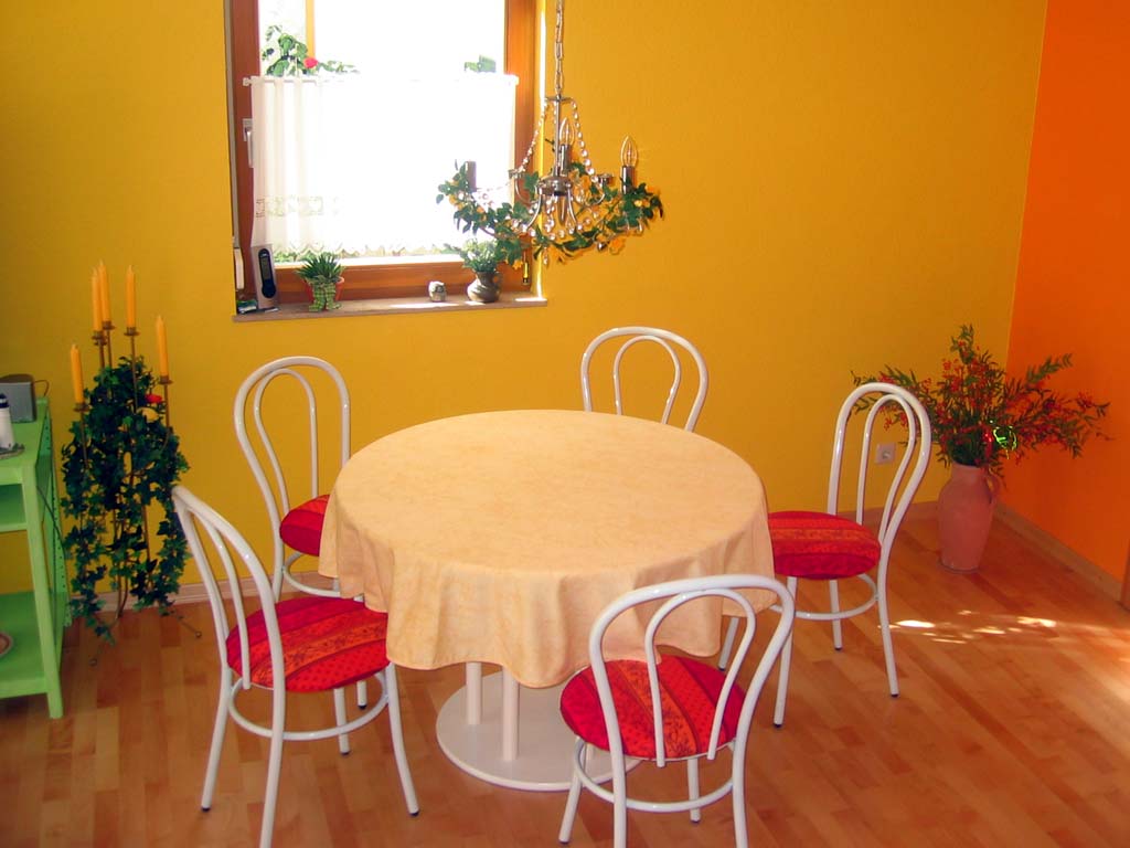 Die alte Sitzecke haben wir ebenfalls behalten. Allerdings haben wir die schwarz/grauen Bezüge gegen einen Stoff aus der Provence ausgetauscht. Rechts sieht man noch ein Stück der Küchenwand. Diese und der Treppenhausbereich sind Orange gehalten. |