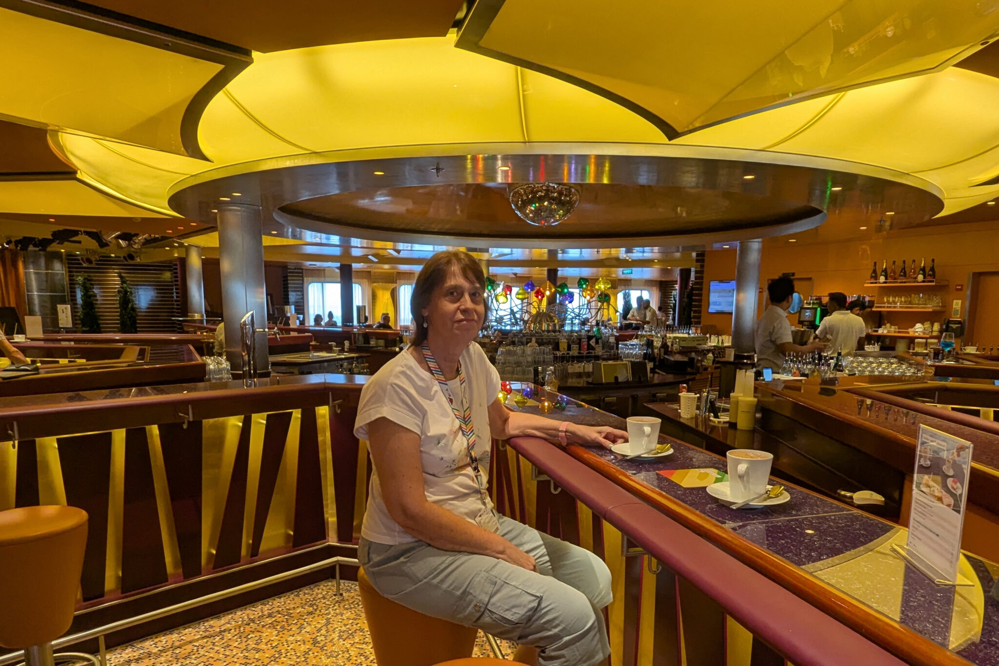 Da wir viele Seetage hatten, war unser Programm dann auch fast immer gleich: Frühstück, Mittag, Kaffee, Abendessen. Unser Lieblingsplatz für die Kaffeezeit war die Stella Bar. Da wir auch Abends für einen Drink da waren, haben uns die Leute vom Service schnell gekannt. Alkoholiker muss man dabei nicht werden – in der Barkarte waren auch einige Alkoholfreie Cocktails aufgelistet, die auch gut geschmeckt haben.