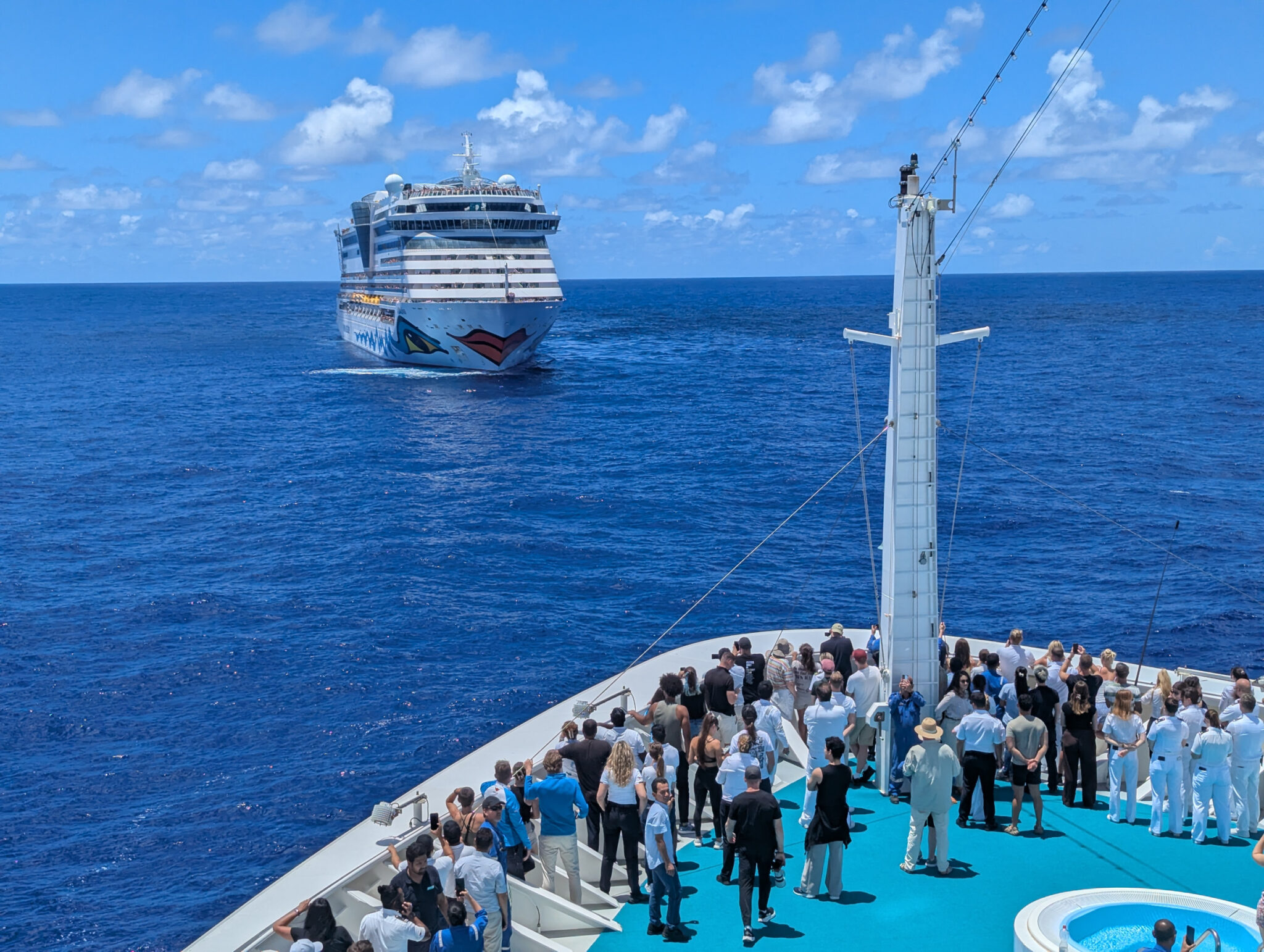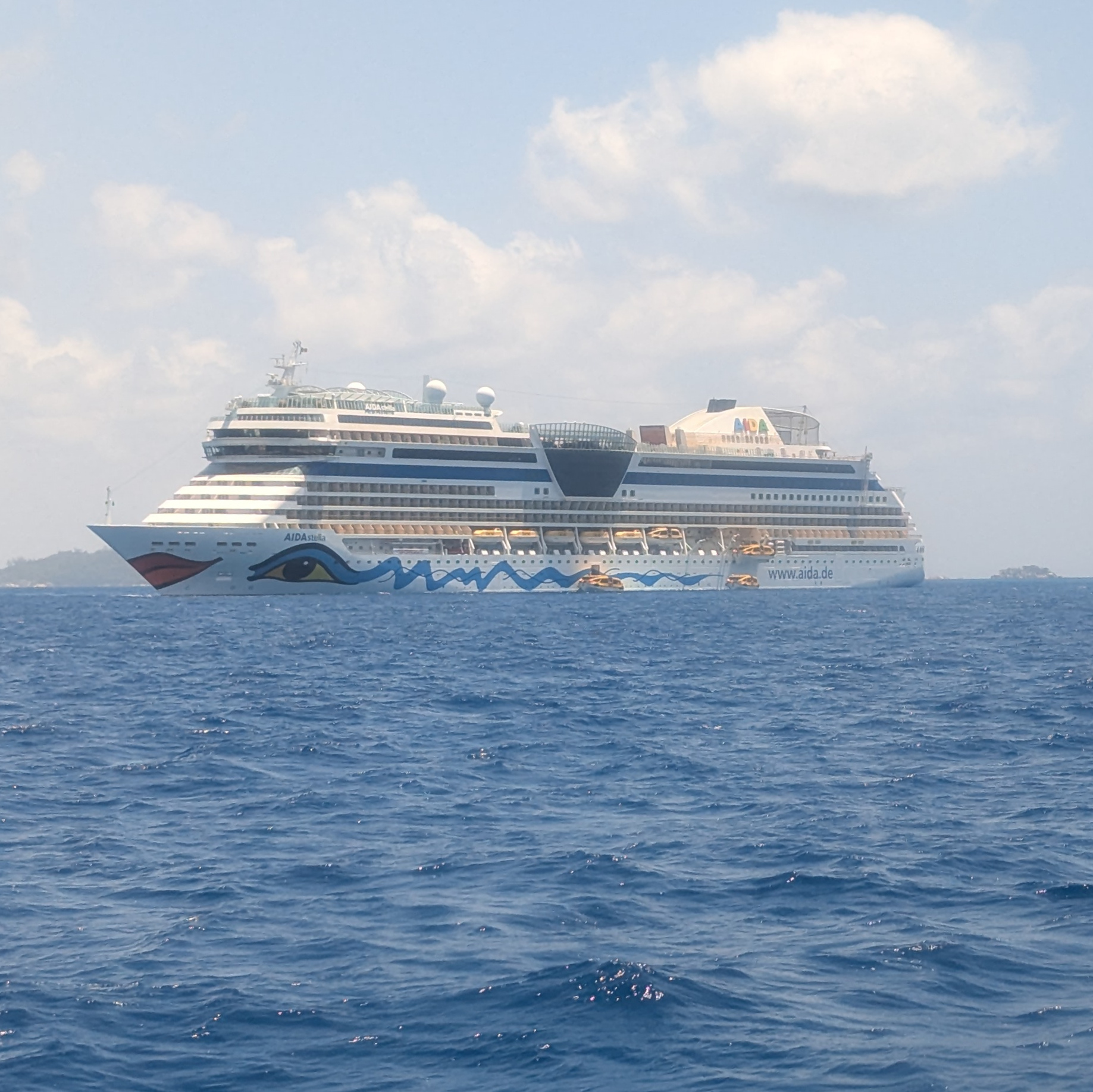 Unterwegs haben wir die Aida Diva getroffen, die auf der entgegengesetzten Route unterwegs war und von Mauritius dann später nach Südafrika weiter gefahren ist. Die Diva ist das gleiche Modell wie die Stella, auf der wir unterwegs waren.